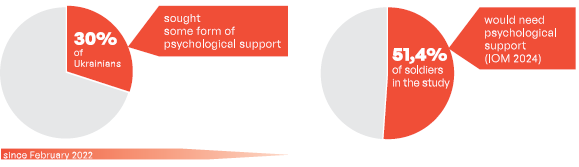 Despite the work of experienced domestic experts and state-sponsored destigmatisation, there is a huge disparity between the urgent needs and capacities in this area, and it may grow further as the war continues. According to an April 2024 IFRC survey, 30% of Ukrainians and Ukrainian women sought some form of psychological assistance after February 2022.2 Further, up to 51.4% of active soldiers and war veterans of the current conflict interviewed in the IOM survey expressed a need for assistance.3 This confirms the progress in destigmatization and the simultaneous massive demand for professional assistance.
